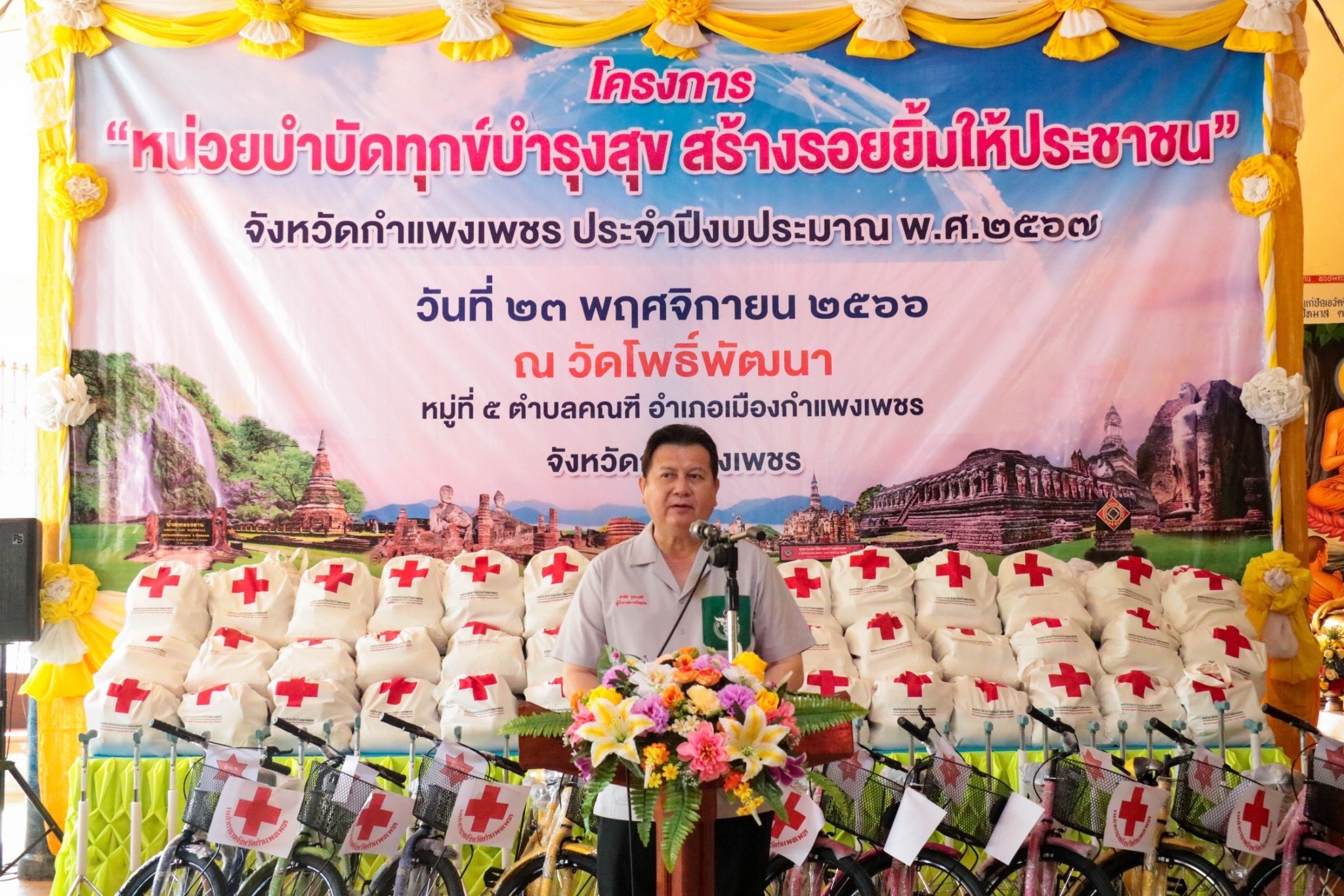 วันที่ 23 พฤศจิกายน 2566 เวลา 08.30 น. สิบเอก ดร.มงคล ศรนวล ศึกษาธิการจังหวัดกำแพงเพชร ร่วมพิธีเปิดโครงการหน่วยแพทย์เคลื่อนที่ พอ.สว. และหน่วยบำบัดทุกข์ บำรุงสุข สร้างรอยยิ้มให้ประชาชน จังหวัดกำแพงเพชร ประจำปีงบประมาณ พ.ศ. 2567 ณ วัดโพธิ์พัฒนา ต.คณฑี อ.เมือง จ.กำแพงเพชร