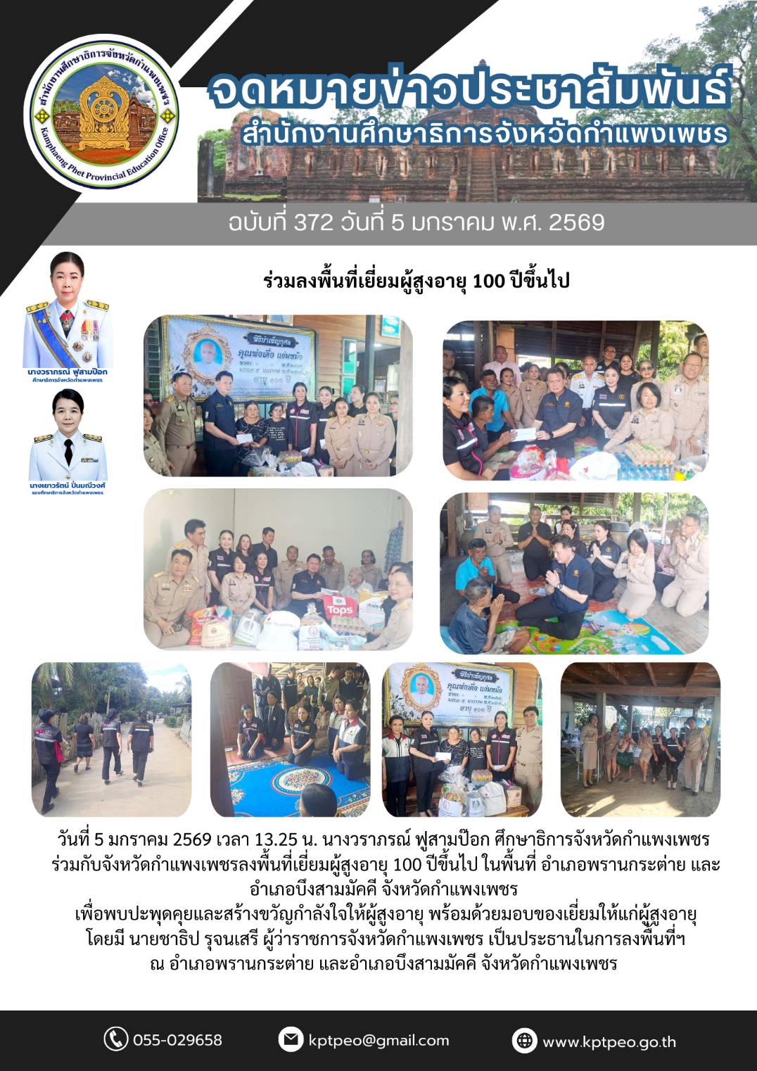 วันที่ 5 มกราคม 2569 เวลา 13.25 น. นางวราภรณ์ ฟูสามป๊อก ศึกษาธิการจังหวัดกำแพงเพชร ร่วมกับจังหวัดกำแพงเพชรลงพื้นที่เยี่ยมผู้สูงอายุ 100 ปีขึ้นไป ในพื้นที่ อำเภอพรานกระต่าย และอำเภอบึงสามมัคคี จังหวัดกำแพงเพชร เพื่อพบปะพุดคุยและสร้างขวัญกำลังใจให้ผู้สูงอายุ พร้อมด้วยมอบของเยี่ยมให้แก่ผู้สูงอายุโดยมี นายชาธิป รุจนเสรี ผู้ว่าราชการจังหวัดกำแพงเพชร เป็นประธานในการลงพื้นที่ฯณ อำเภอพรานกระต่าย และอำเภอบึงสามมัคคี จังหวัดกำแพงเพชร