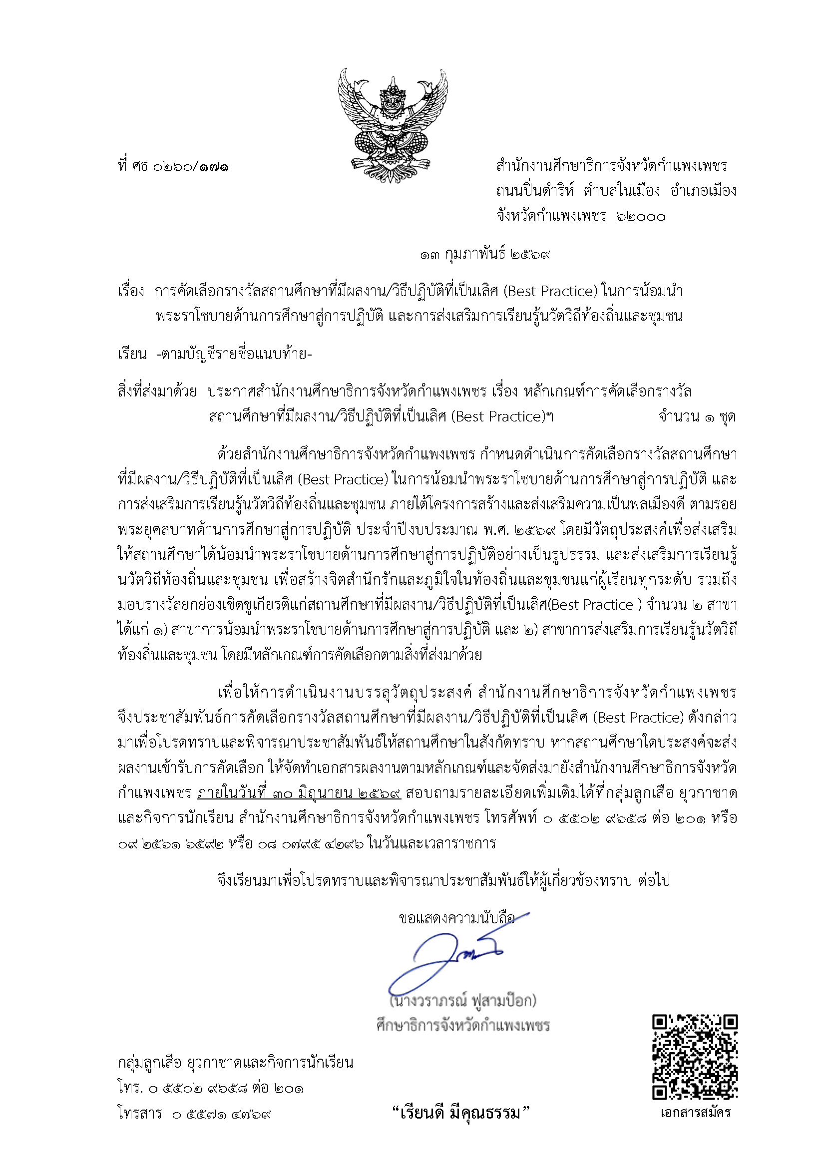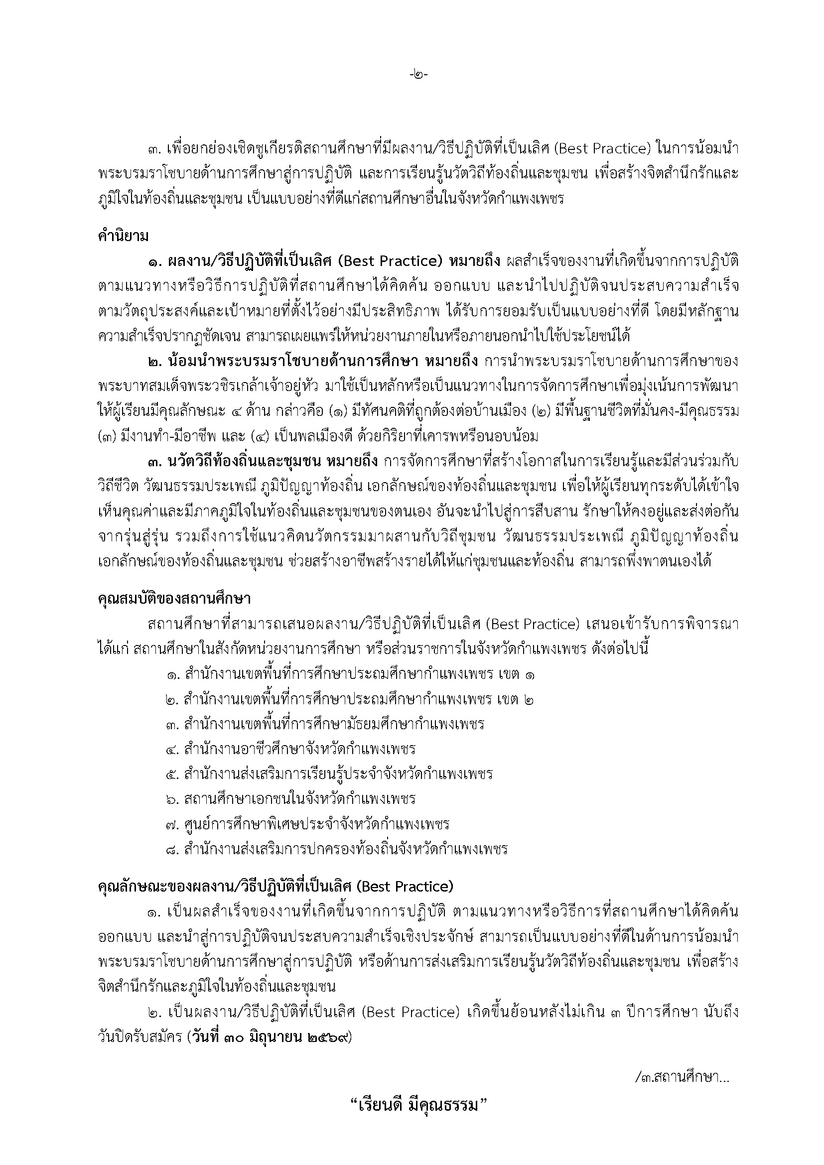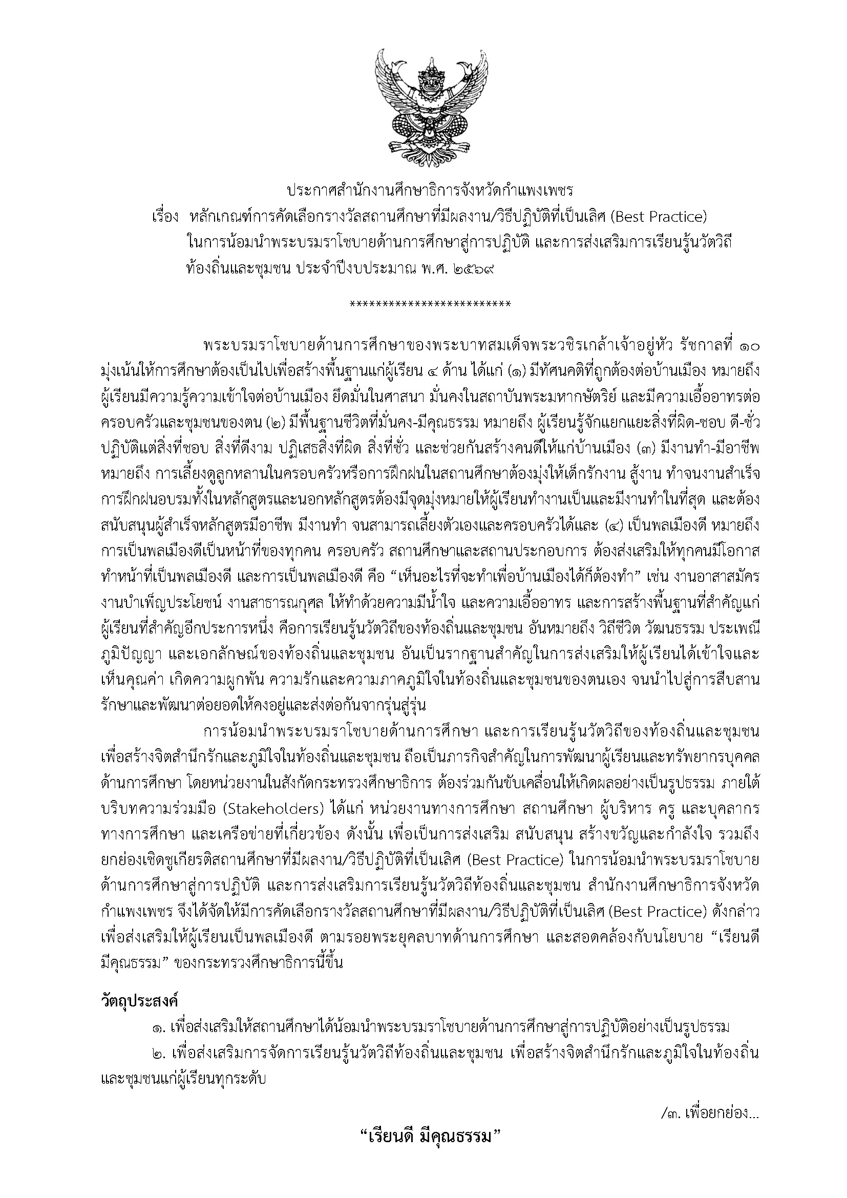 สำนักงานศึกษาธิการจังหวัดกำแพงเพชร เชิญชวนสถานศึกษาส่งผลงานเข้ารับการคัดเลือก รางวัลสถานศึกษาที่มีผลงาน/วิธีปฏิบัติที่เป็นเลิศ (Best Practice) ภายใต้โครงการสร้างและส่งเสริมความเป็นพลเมืองดี ตามรอยพระยุคลบาทด้านการศึกษาสู่การปฏิบัติ ประจำปีงบประมาณ 2569