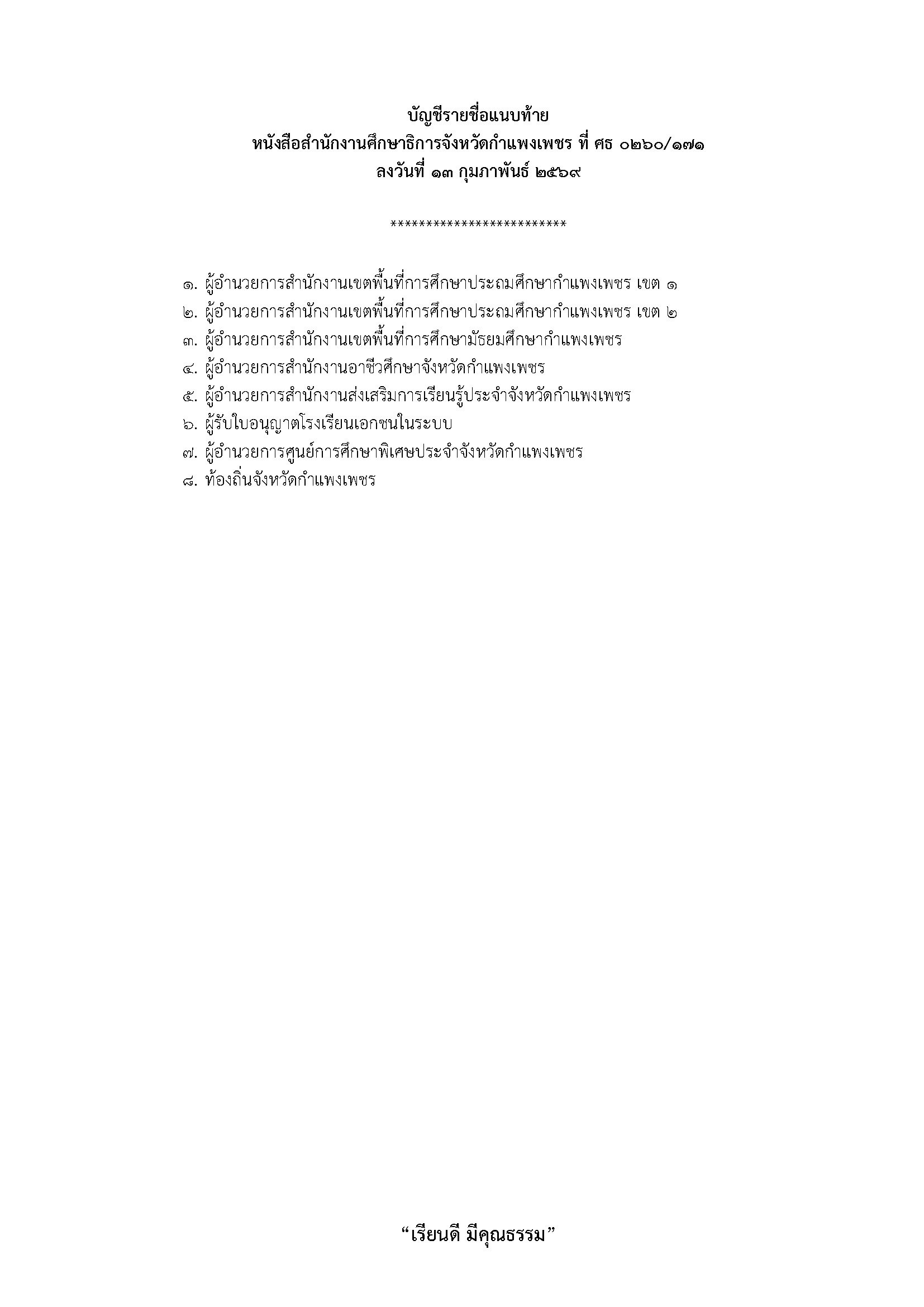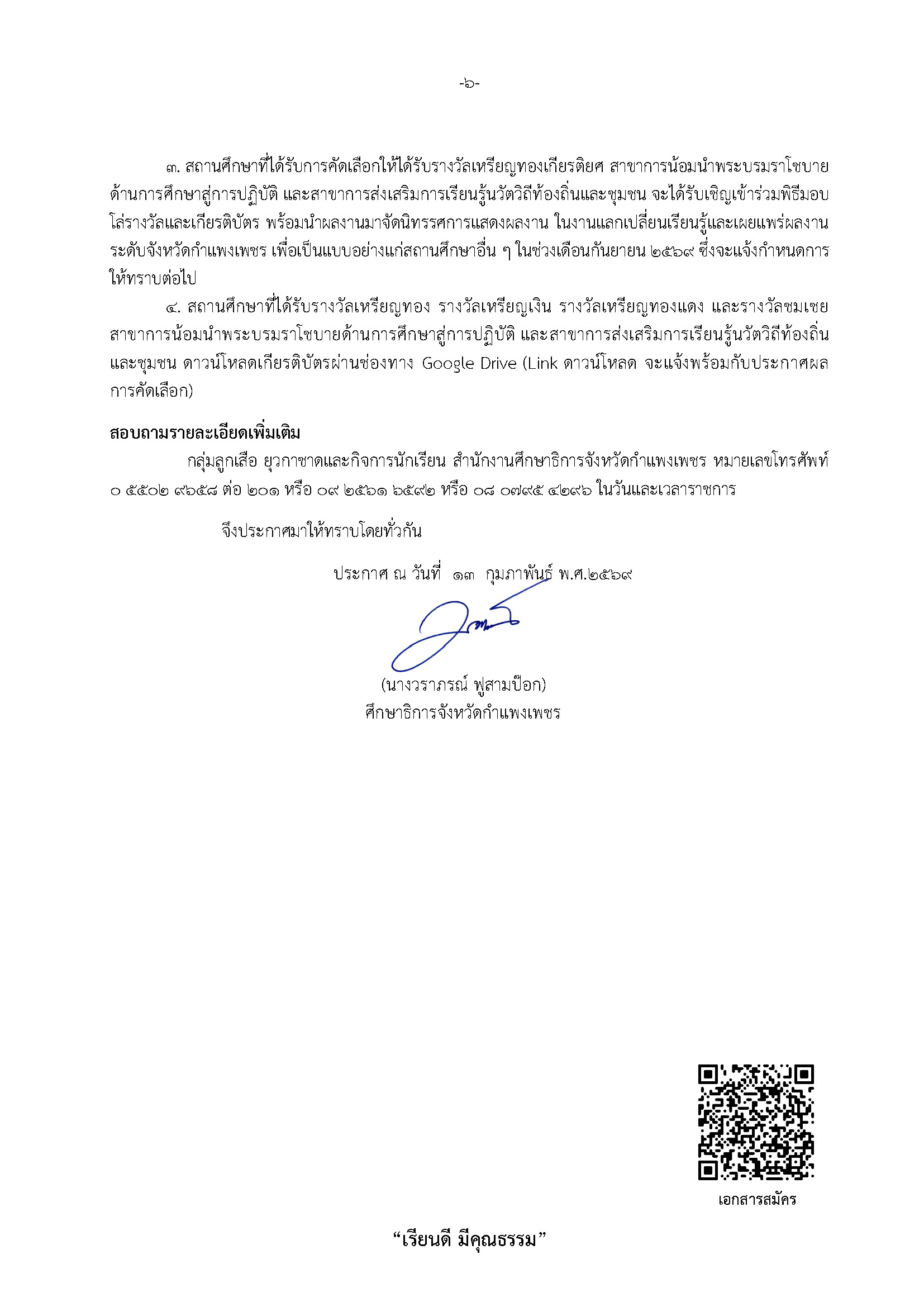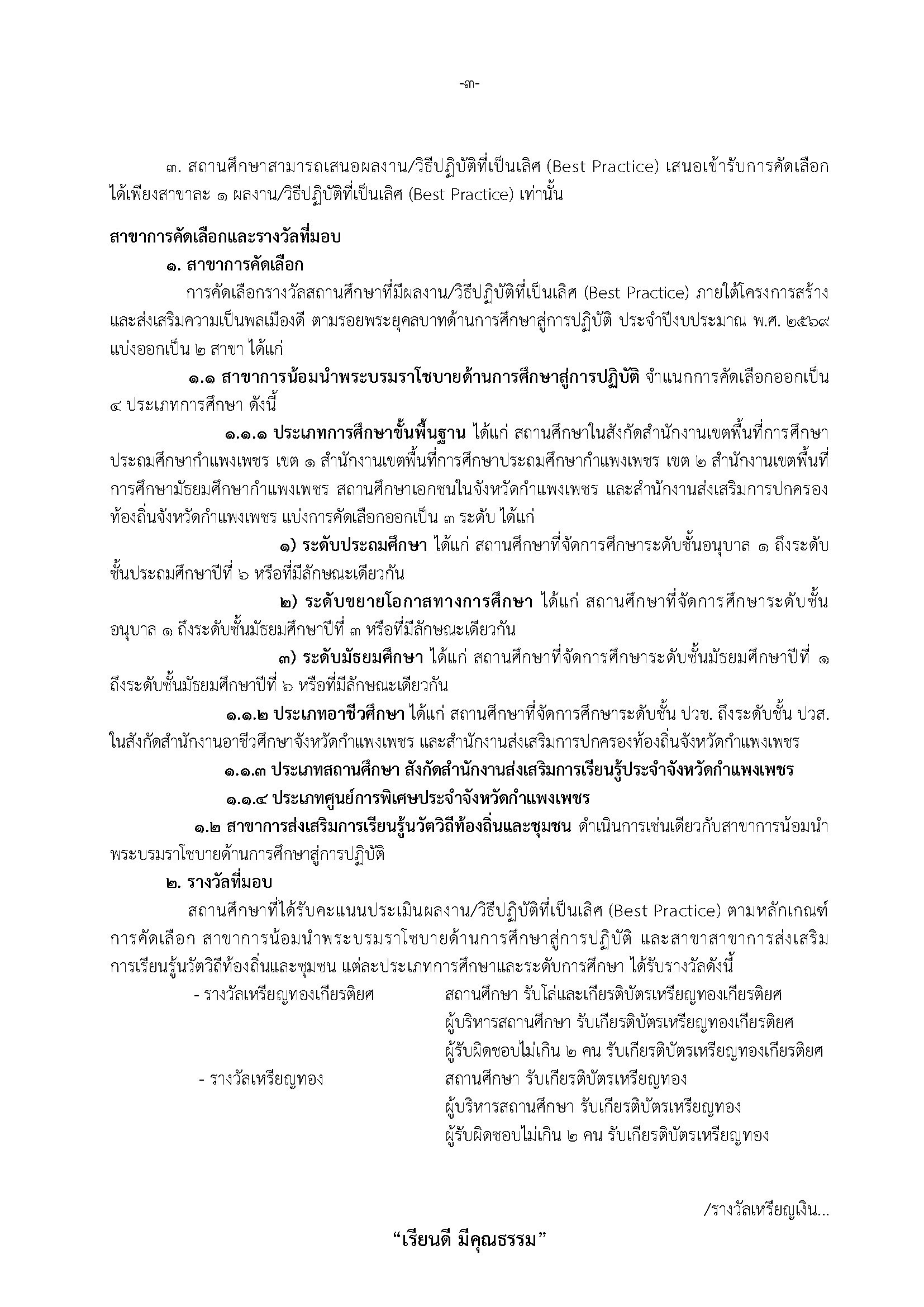 สำนักงานศึกษาธิการจังหวัดกำแพงเพชร เชิญชวนสถานศึกษาส่งผลงานเข้ารับการคัดเลือก รางวัลสถานศึกษาที่มีผลงาน/วิธีปฏิบัติที่เป็นเลิศ (Best Practice) ภายใต้โครงการสร้างและส่งเสริมความเป็นพลเมืองดี ตามรอยพระยุคลบาทด้านการศึกษาสู่การปฏิบัติ ประจำปีงบประมาณ 2569