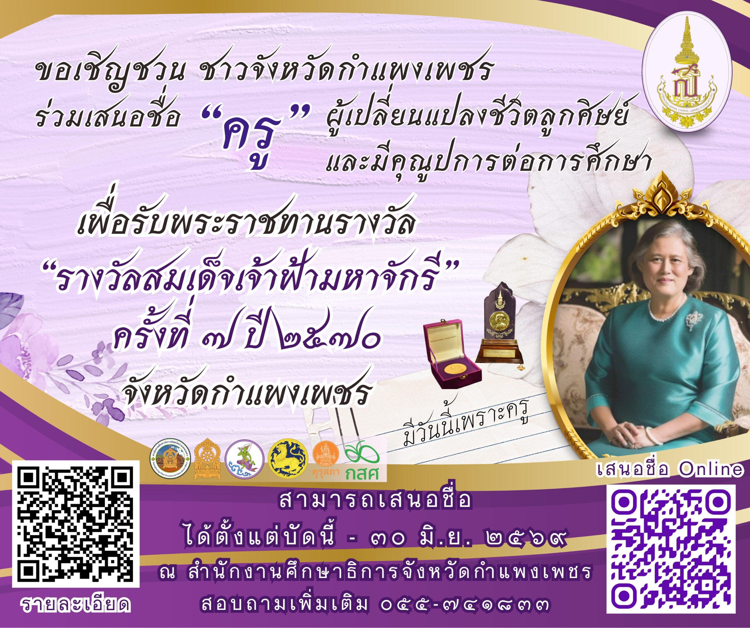 ขอเชิญชวนชาวกำแพงเพชร ร่วมเสนอชื่อครูผู้สร้างการเปลี่ยนแปลง ครูผู้สร้างคุณูปการต่อการศึกษาของจังหวัดกำแพงเพชร เพื่อเข้าร่วมการพิจารณารางวัล “สมเด็จเจ้าฟ้ามหาจักรี” จังหวัดกำแพงเพชร ครั้งที่ 7 ประจำปี 2570